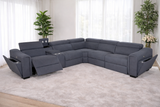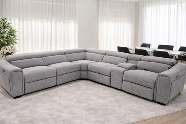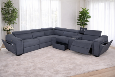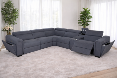 Curate a haven of entertainment and lavish relaxation with the Byron Fabric Powered Modular Recliner Sofa (Dark Grey/Light Grey). Offering a modern silhouette crafted from plywood framing, delight in the enduring support of S-springs, pocket springs and webbing while revelling in the sumptuous feel of foam seat cushioning with foam and poly-fibre back filling. Boasting six adjustable headrests and two convenient powered reclining actions for luxe head and footrest relaxation, enjoy the top tech appeal of pop-out side arm storage with wireless charging paired with a light-equipped storage console with additional cup holder real estate.