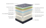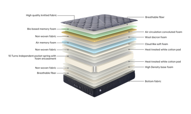 This mattress combines eco-friendly materials like bio-based memory foam and recycled polyester fabric with advanced comfort features like wool Dacron foam and pocket springs. Offering superior support, temperature regulation, and durability, it provides a luxurious, environmentally conscious sleep experience.