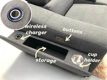 - Pop-out side arm storage with wireless charging keeps your devices powered and ready to go.