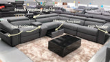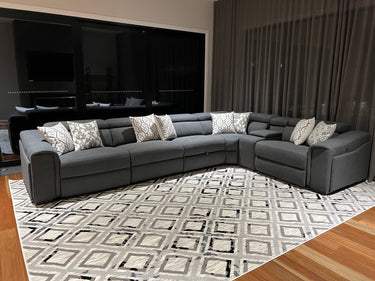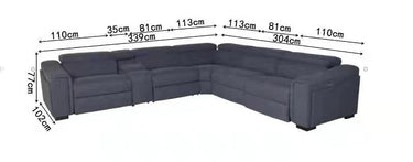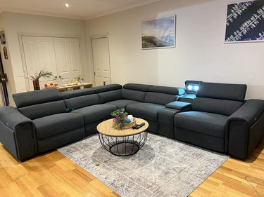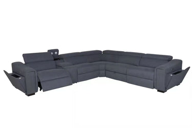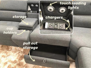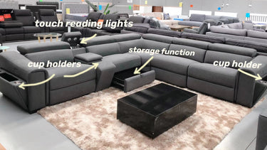 Curate a haven of entertainment and lavish relaxation with the Byron Fabric Powered Modular Recliner Sofa (Dark Grey/Light Grey). Offering a modern silhouette crafted from plywood framing, delight in the enduring support of S-springs, pocket springs and webbing while revelling in the sumptuous feel of foam seat cushioning with foam and poly-fibre back filling. Boasting six adjustable headrests and two convenient powered reclining actions for luxe head and footrest relaxation, enjoy the top tech appeal of pop-out side arm storage with wireless charging paired with a light-equipped storage console with additional cup holder real estate.