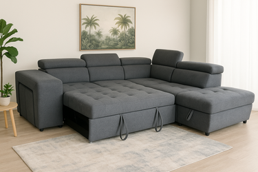 The Larissa 4 Seater Sofa Bed and 2 Stools Set offers a perfect blend of modern style and practical functionality. This set includes a pull-out sofa bed, a right-hand-facing chaise, and a large storage ottoman. The two hidden stools are ideal for extra seating or as convenient footrests. The adjustable headrests provide personalized comfort, making it a versatile choice for any living space. Upholstered in high-quality fabric, the Larissa combines comfort and functionality, fitting seamlessly into your home.