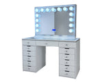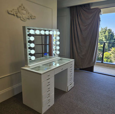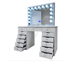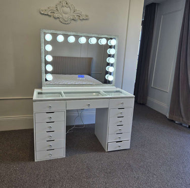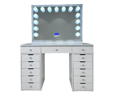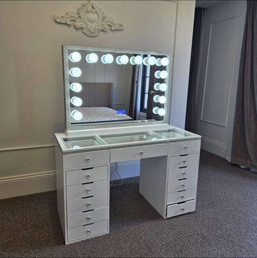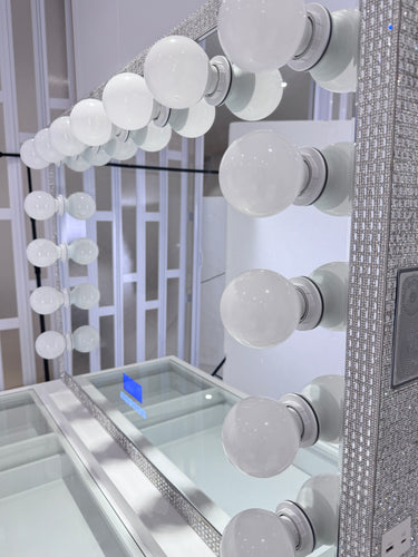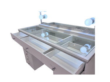 Stunning looking 13 drawers clear see-through glass top beauty station & Large Hollywood Makeup Mirror with led light and blue tooth speaker.