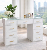 Elevate your space with the elegant Lustria White Vanity Table, crafted with exquisite attention to detail. Finished in a premium white quality paint, this statement piece features 9 spacious drawers adorned with luxurious golden handles, offering both beauty and ample storage.