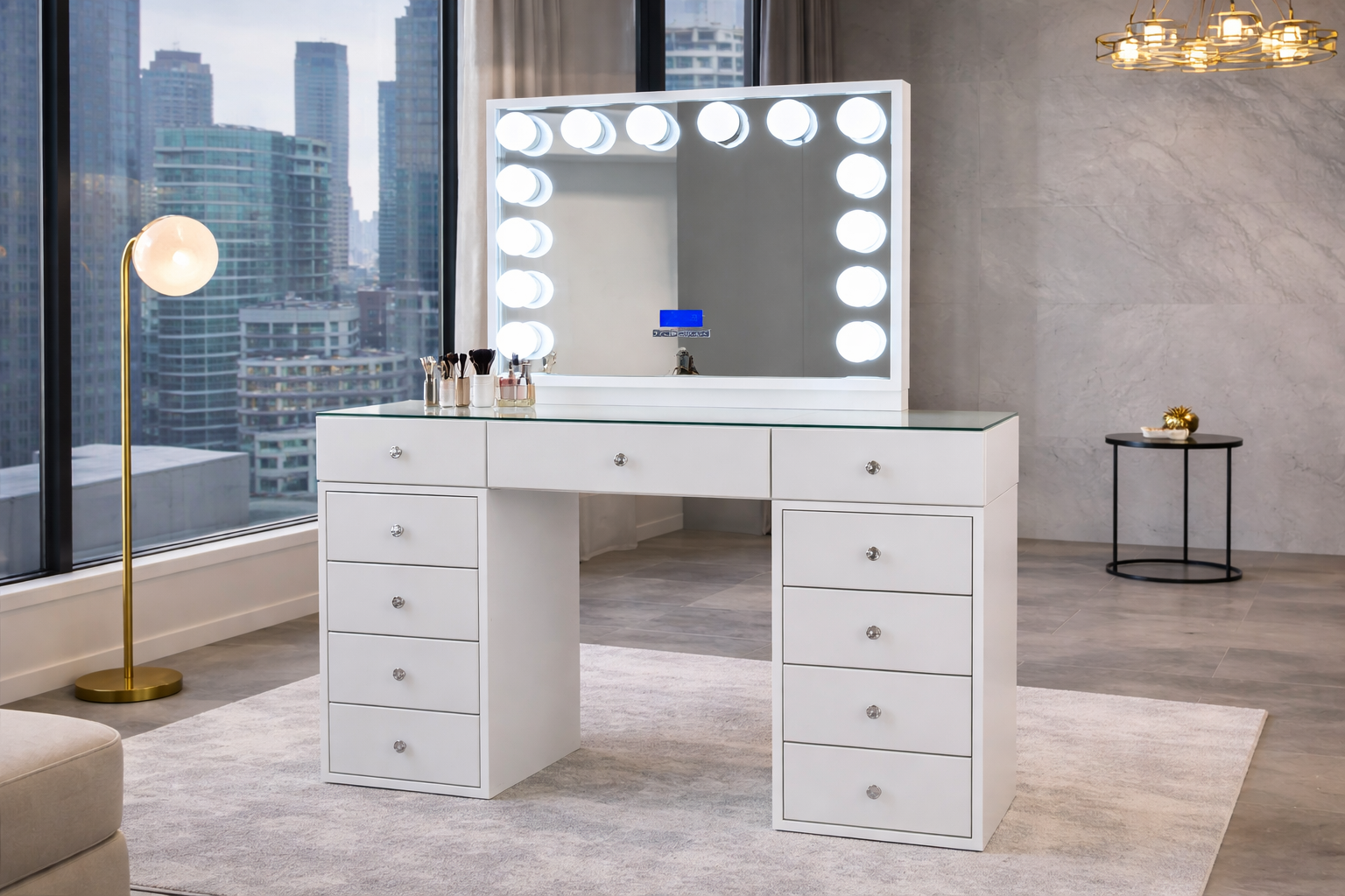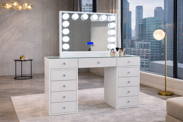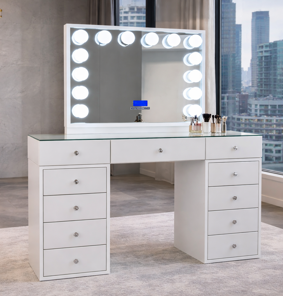 Stunning looking 11 drawers clear see-through glass top beauty station & Large Hollywood Makeup Mirror with led light.