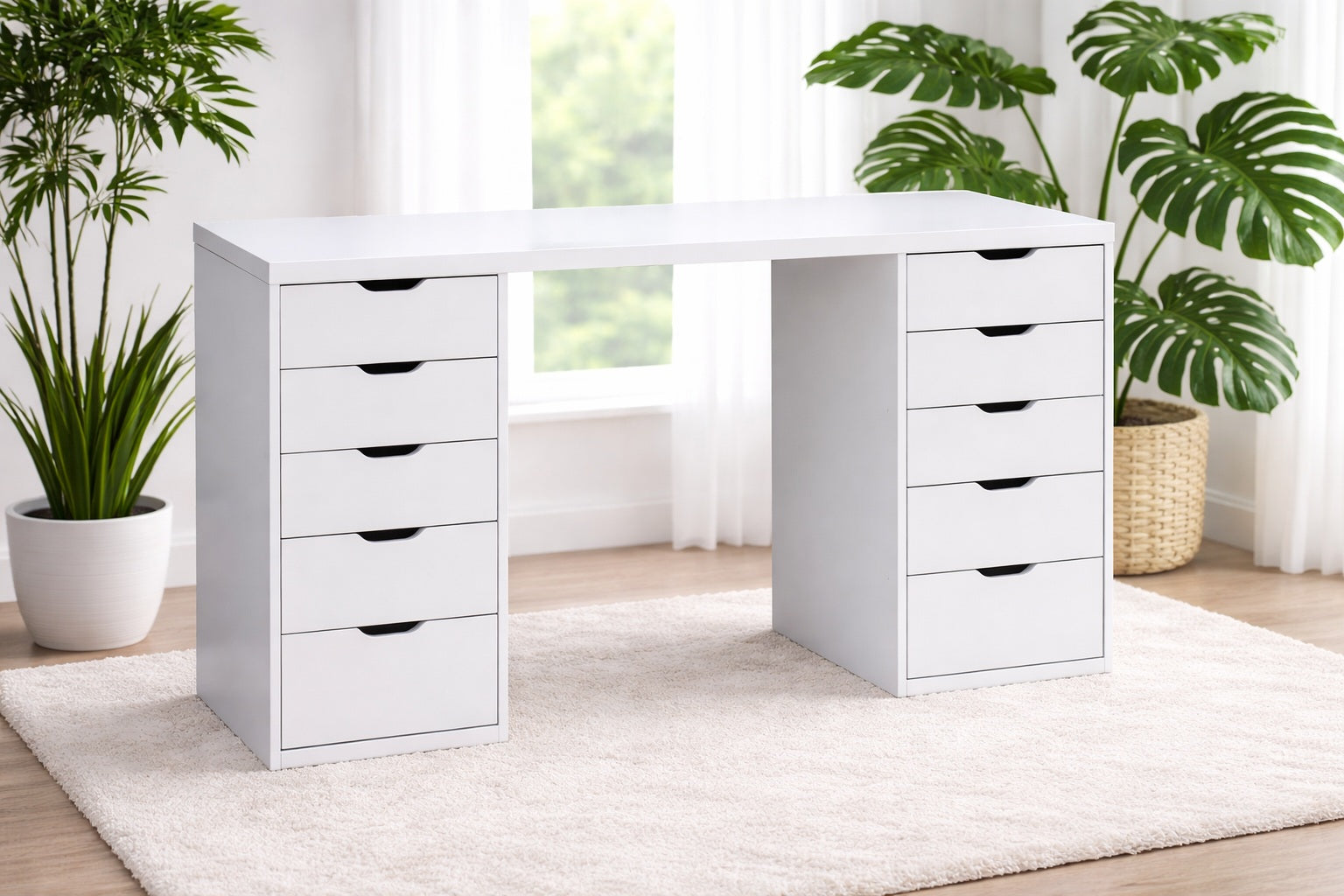 The Raya Vanity Make-Up Table is both functional and versatile, combining simplicity with style to elevate your dressing room. Featuring 10 spacious drawers, it provides ample storage for all your beauty products, keeping your space neat and organized. Its unique and classic design adds a touch of elegance, seamlessly complementing any décor. Whether for makeup, skincare, or accessories, this table is the perfect addition to your dressing room or bedroom.